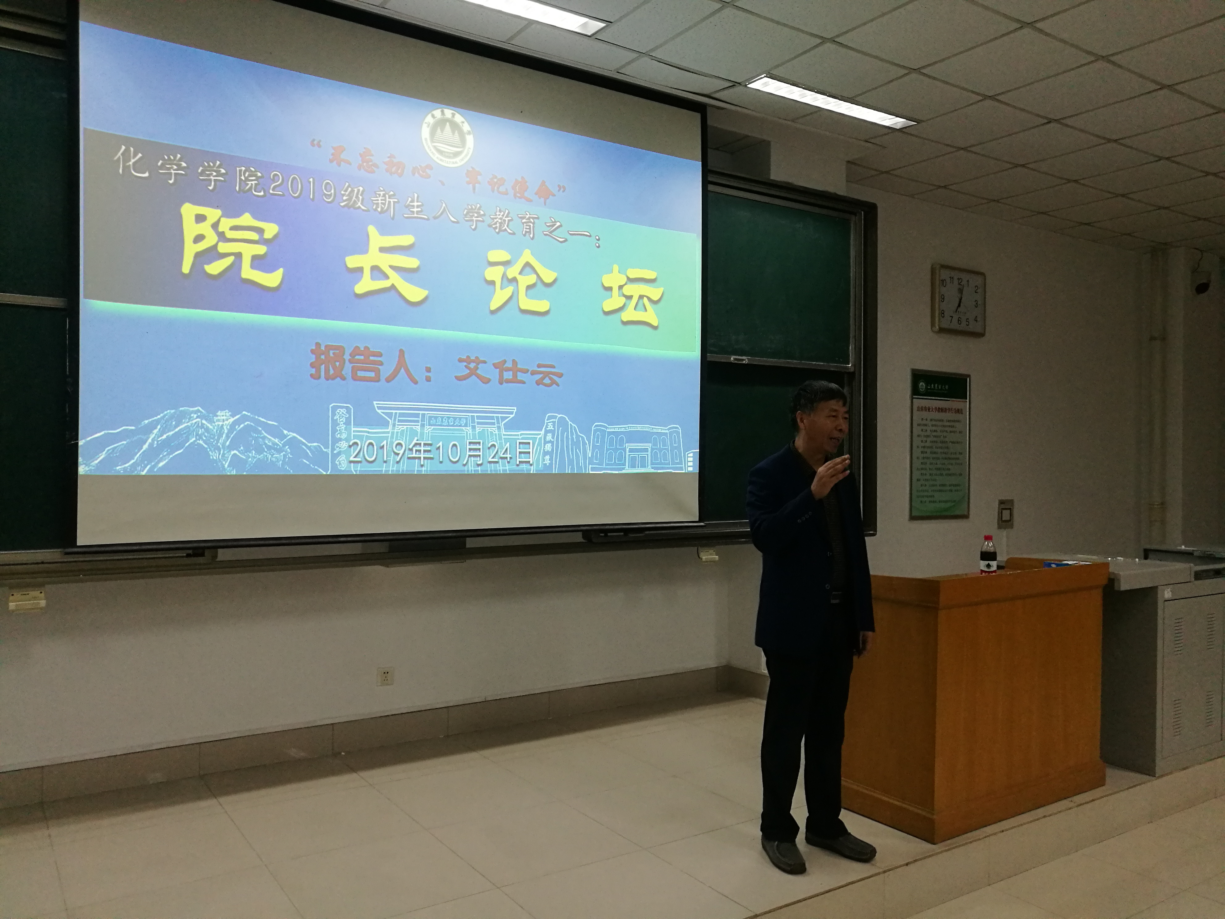 扎实做好新生入学教育,10月24日晚,化学学院于南校区综合楼N403举行院长论坛,学院院长艾仕云作了题为“树理想、明目标、做有为青年”的主题报告,学院党委副书记李华、辅导员赵伟烨及2019级全体新生参会。