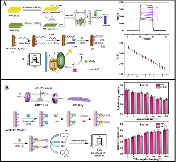 图2. 基于MnO2纳米材料(A)和纳米酶催化沉淀(B)的DNA甲酰化光电化学传感器的构建 (Journal of Colloid and Interface Science2020, 561, 348-357、Biosensors and Bioelectronics 2020, 151, 11973)。