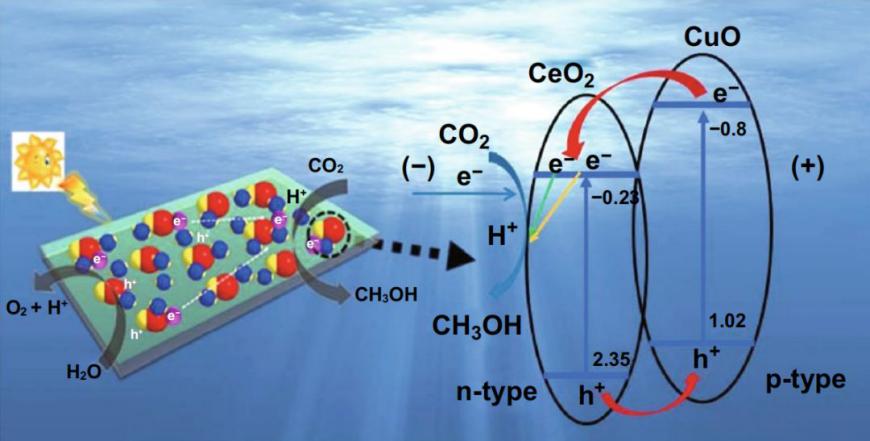 本论文作者及其团队利用p型的CuO纳米颗粒和n型的CeO纳米颗粒形成p-n结改性Cu催化剂,合成一种用在CO2光电催化还原向甲醇转化的高效催化剂 CeO2 NPs/CuO NPs/Cu。在可见光照射和-1.0 V的外加电压条件下,该催化剂催化产生甲醇的速率为3.44 μmol/cm2/h,大约是CuO NPs/Cu催化剂催化效率 (0.67 μmol/cm2/h)的五倍。在CuO NPs/Cu表面沉积了花状CeO2 NPs后,由于CuO和CeO2的导带光激发电子的协同作用,系统的载流子数量提升了约108倍,大大增强了CO2光电催化转化为甲醇效率。光激发电子在p-n结之间的流动对于CeO2 NPs/CuO NPs/Cu催化性能的提升有着至关重要的作用。本实验研究成果显示出该复合材料在CO2催化还原领域的重要作用。