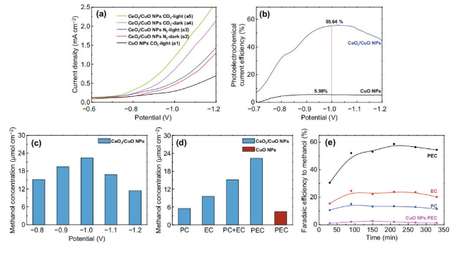 图3 .(a)不同电极在光照和黑暗条件下的线性扫描伏安曲线。在通入N2或CO2条件下,在0.1mol/L KHCO3溶液中收集获得数据;(b)不同电极的光电转换效率;(c)CeO2 NPs/CuO NPs催化剂在光照6.5 h后在不同电势下的甲醇浓度;(d)PEC,EC和PC在-1.0 V下将CO2还原为6.5 h后的甲醇浓度;(e) PEC,EC和PC在-1.0 V的条件下将CO2还原为甲醇的法拉第效率。