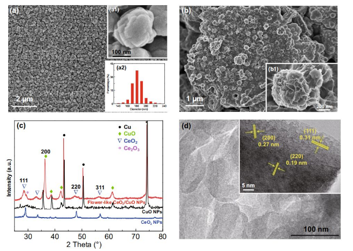 图2. (a)低放大倍数和(a1)高放大倍数下的CuO NPs的SEM图像;(a2) CuO NP的粒度分布;(b)低倍放大和(b1)高放大倍数时类似类CeO2 NP的SEM图像;(c)XRD衍射图谱CuO NP和花状的CeO2 NPs/CuO NPs;(d)CeO2 NP的HRTEM图像,插图显示高倍放大图像,显示CeO2的晶格条纹特征。
