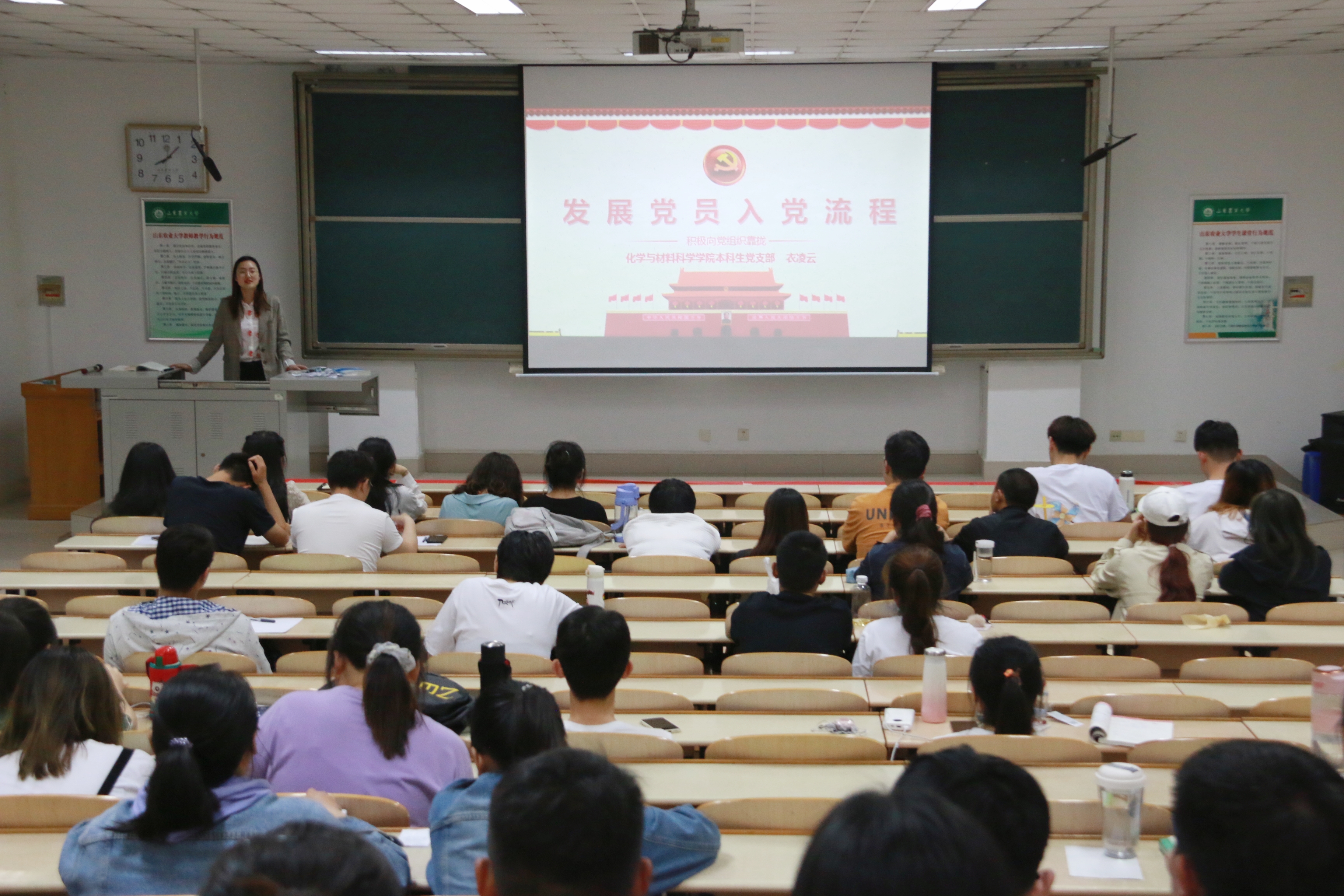 最后,辅导员衣凌云老师从入党的标准及条件,发展对象的确定、培养和考察,预备党员的接受,预备党员的管理、考察和转正四个方面详细介绍了发展党员入党的二十五个基本流程。更加明确规范了入党的步骤,激发了同学们“以实际行动积极向党组织靠拢”的决心。