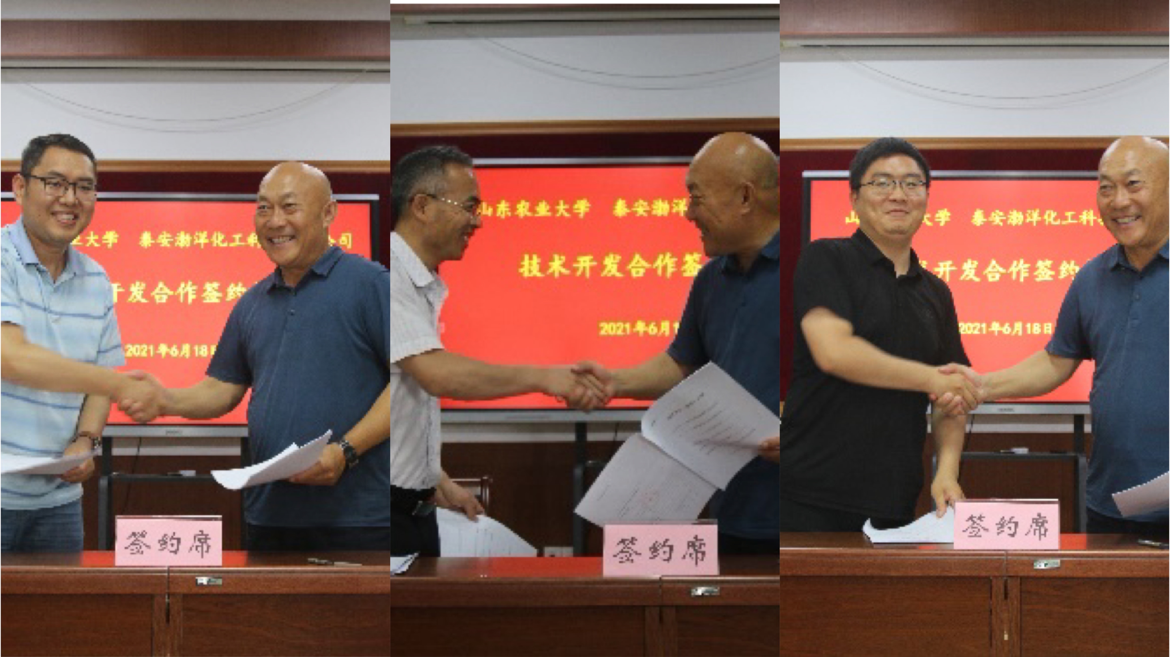 最后,三位老师分别就所负责的项目与泰安渤洋化工科技有限公司董事长祝兴奎签署了技术开发合作协议。校企双方均表示将以本次签约为契机,加强良性互动,今后在科学研究、技术开发、人才培养等方面进一步加强合作,产出丰硕成果。