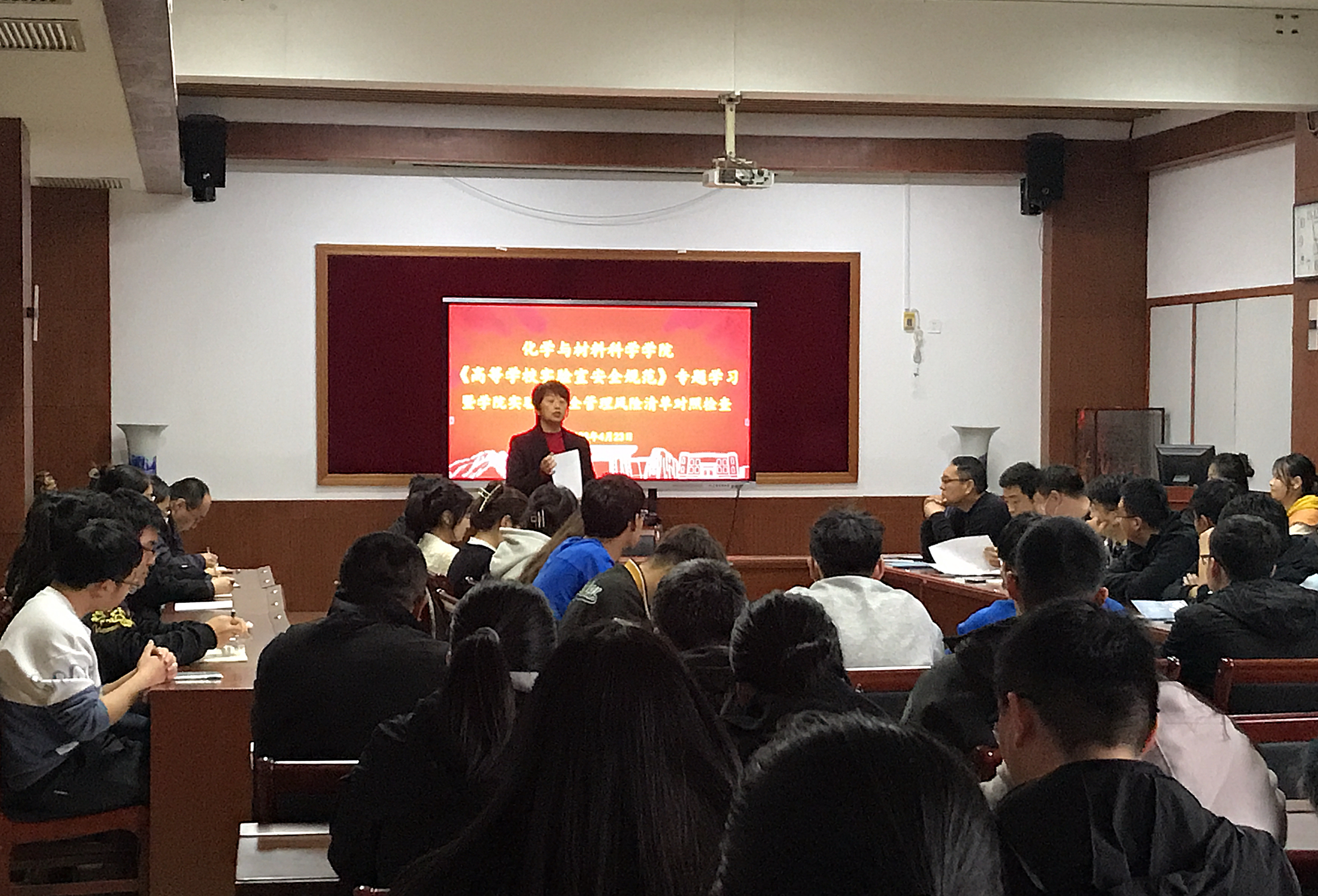 为进一步加强实验室安全工作,确保实验室安全有序运行和科研工作的顺利开展,4月23日,化学学院举办《高等学校实验室安全规范》专题学习暨学院实验室安全管理风险清单对照检查会议,副院长徐静主持会议,相关老师和全体研究生参加会议。