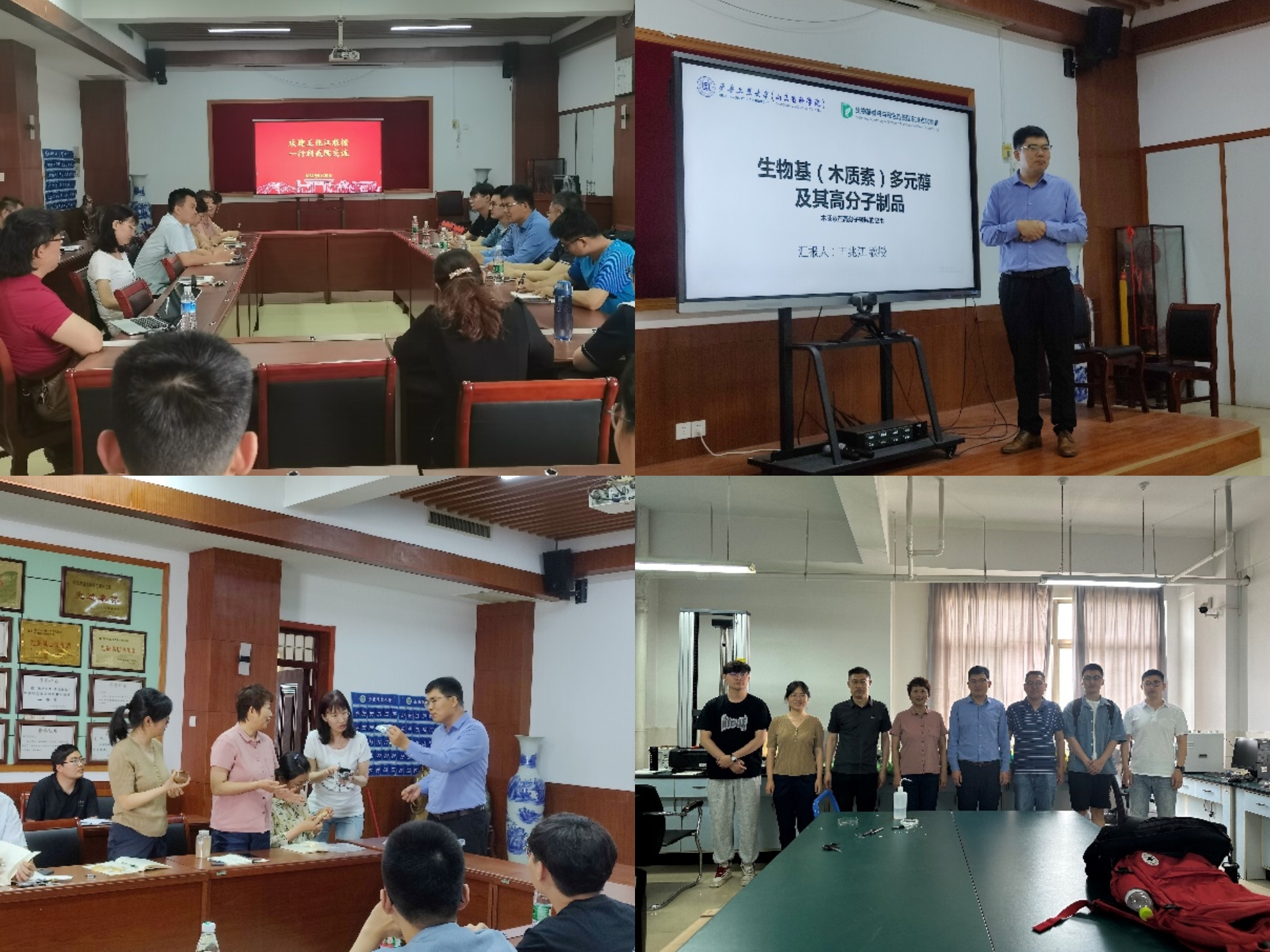 王兆江教授为大家介绍了齐鲁工业大学生物基材料与绿色造纸国家重点实验室研究方向和团队建设等情况,结合国家战略和社会应用需求介绍了其团队在制浆造纸技术及其附加值产品方面的应用创新工作。其中,王教授在木质素多元醇基制品开发与应用方面开展的研究工作引起学院师生热烈讨论。交流会后,王教授、苑教授与我校多名老师达成初步合作意向,将会进一步推动生物质材料在缓控释包覆、可降解农膜、催化、储能领域的深入研究。