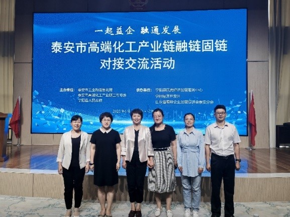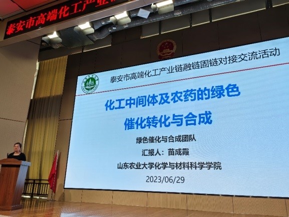 6月29日,泰安市高端化工产业链融链固链对接交流活动在宁阳举办。我院绿色催化与合成创新团队受邀参加,苗成霞教授作为团队负责人做了题为《化工中间体及农药的绿色催化转化与合成》的交流报告,重点介绍了团队情况、研究工作、合作实例和技术对接四部分内容,并与相关企业进行了交流。