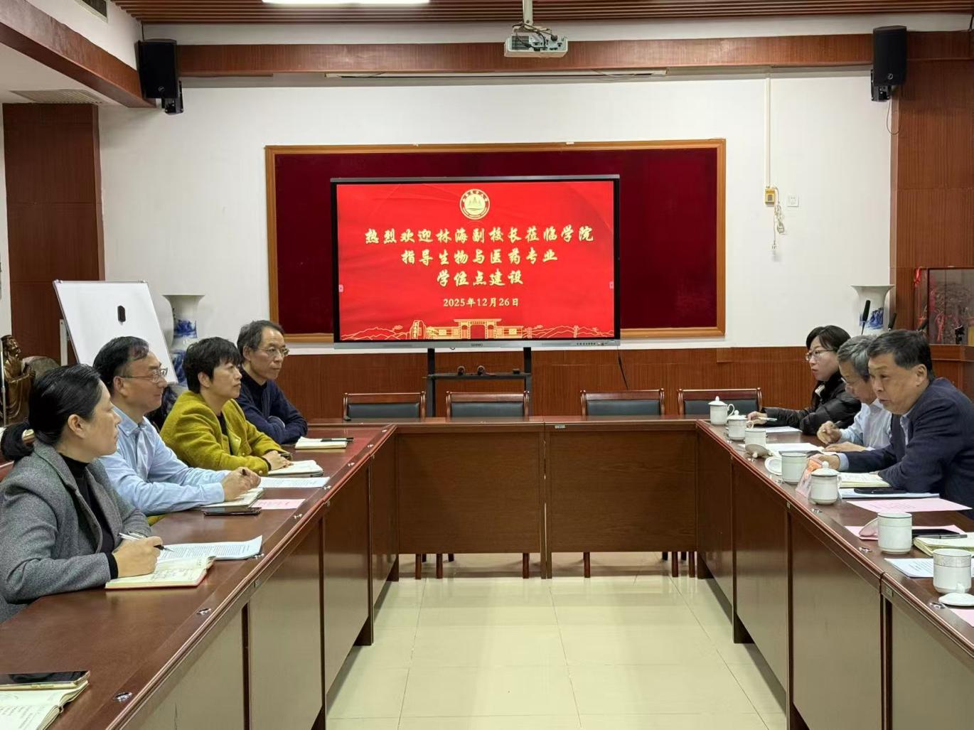为全面掌握生物与医药专业学位授予点建设成效,精准研判发展形势,统筹推进学位点提质增效,12月26日,副校长林海、研究生处处长许永玉及研究生处相关人员一行莅临我院,召开生物与医药专业学位授予点建设专项调研座谈会。学院党委书记吴连军、院长徐静、副院长张丽丽,以及学位点学科带头人韩福社、建设负责人许晓玉、制药工程专业主任李映等参与座谈。