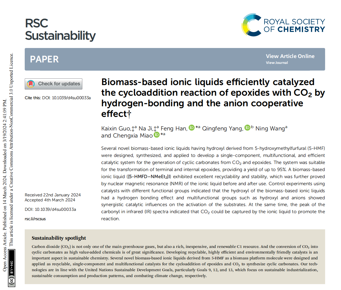 近日,山东农业大学韩峰副教授和苗成霞教授带领的绿色催化与合成研究团队利用生物质平台分子5-羟甲基糠醛(HMF)设计合成了一系列生物质基离子液体催化剂(已申报专利,并授权,ZL 202111634418.4),并且利用该生物质基离子液体催化体系,高效实现了环氧化合物与CO2的催化环化反应。该成果以“Biomass-based ionic liquids efficiently catalyzed the cycloaddition reaction of epoxides with CO2 by hydrogen-bonding and the anion cooperative effect”为题,发表在英国皇家化学会期刊RSC Sustainability上,我院研究生郭开欣和纪钠分别为该文章的第一作者和共同第一作者,韩峰副教授和苗成霞教授为该文的通讯作者,我校为唯一通讯单位。