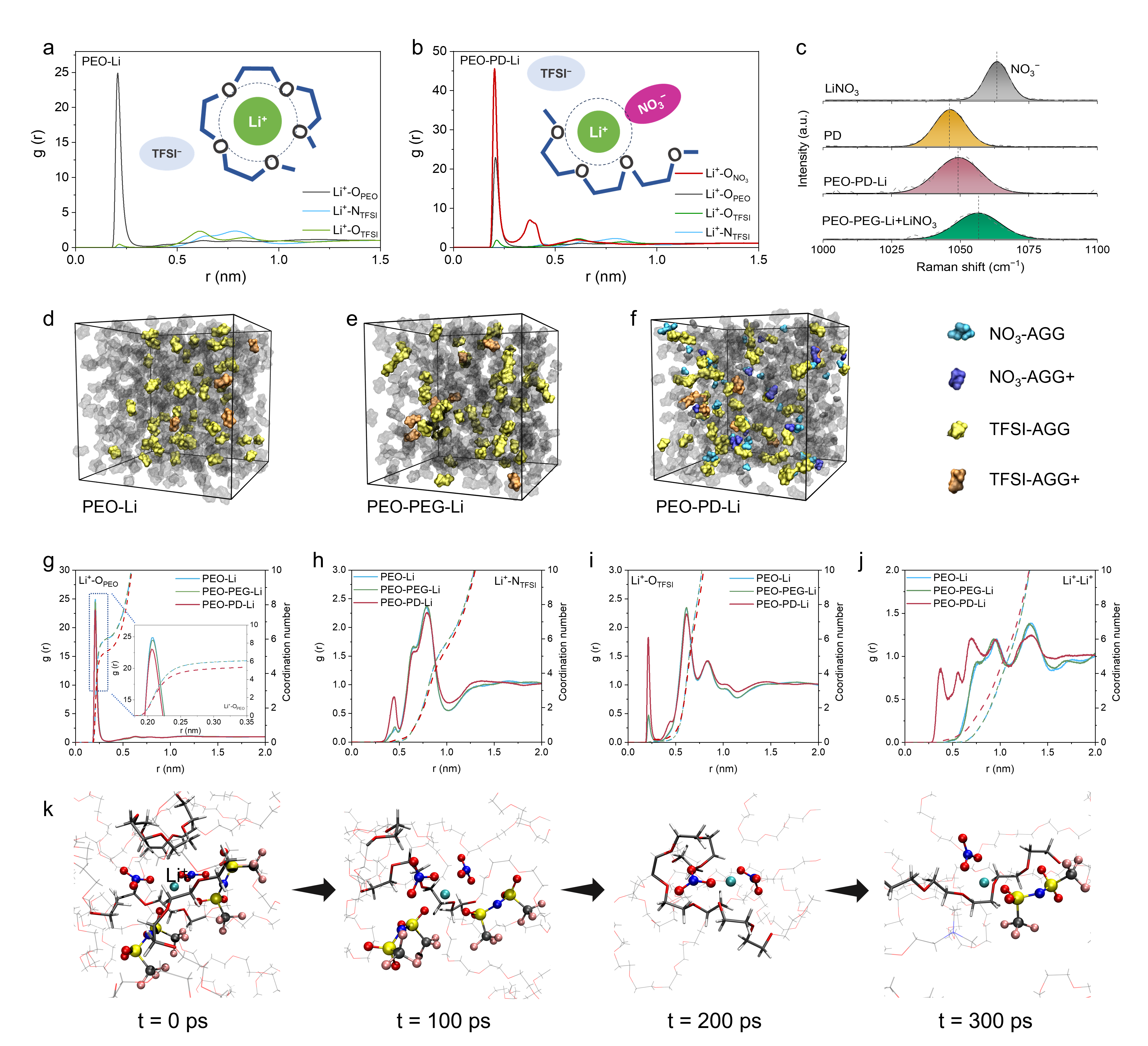 To address these challenges, the research team proposed a liquid-plasticizer-free and multiscale engineering strategy. By synergistically optimizing the macroscopic structure, mesoscopic segmental motion, and microscopic solvation configuration of PEO electrolytes, they achieved ultra-long lifespan cycling for lithium metal batteries under high voltage and room temperature conditions without introducing any liquid components. This provides a proof-of-concept for designing high-performance PEO electrolytes. Specifically, a PEG-PDMAEMAH+·NO3− (abbreviated as PD) copolymer is designed and synthesized and introduced it into a high molecular weight PEO (Mv ≈ 600,000 g mol−1) matrix. The PD copolymer could easily dissociates into PEG-PDMAEMAH+ (PD+) polycations and high-donor-number NO3− anions. The large, flexible PD+ cation provides excellent solubility for NO3−, overcoming the solubility limitations of traditional nitrate additives. Simultaneously, at the macro/mesoscopic level, the good compatibility between PD+ and PEO effectively promotes PEO amorphization and chain segment motion, avoiding the phase separation and ion blocking issues associated with conventional additives or fillers.
